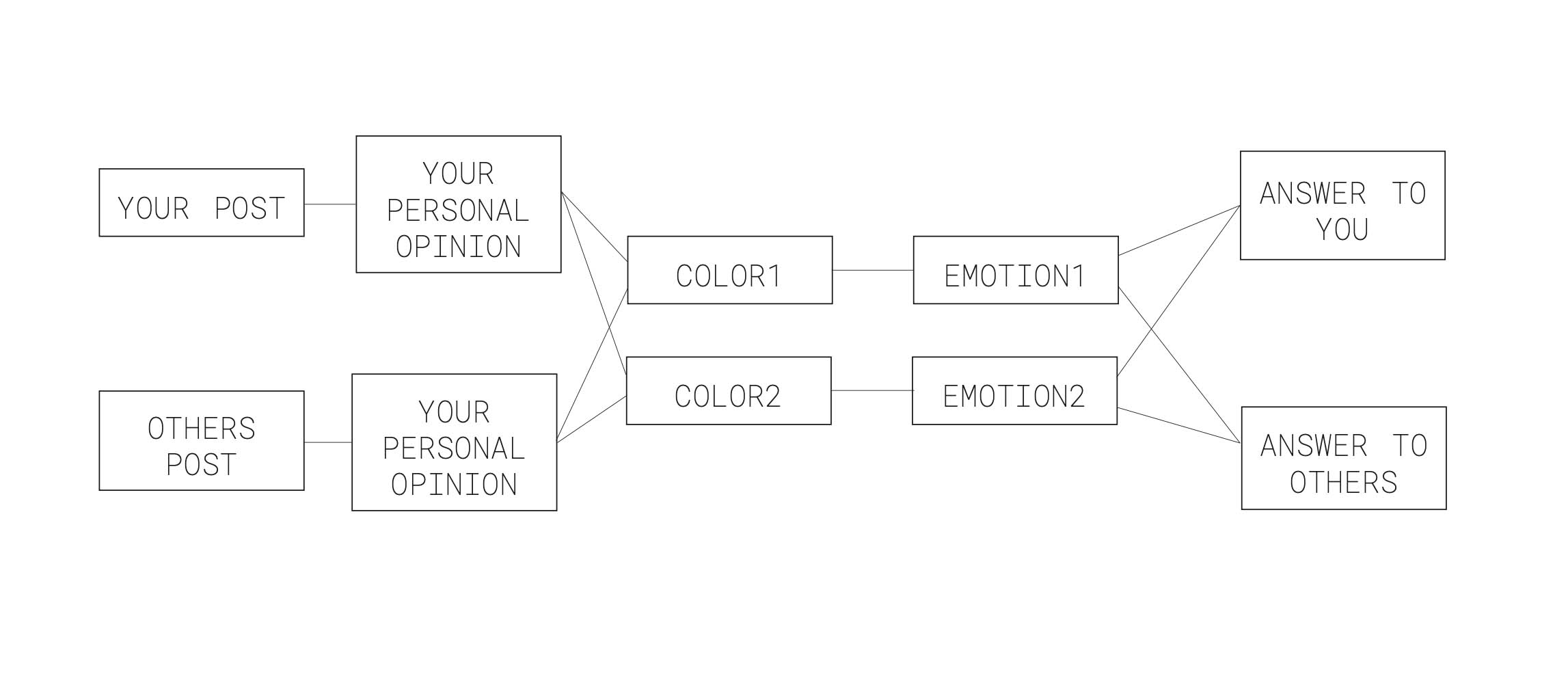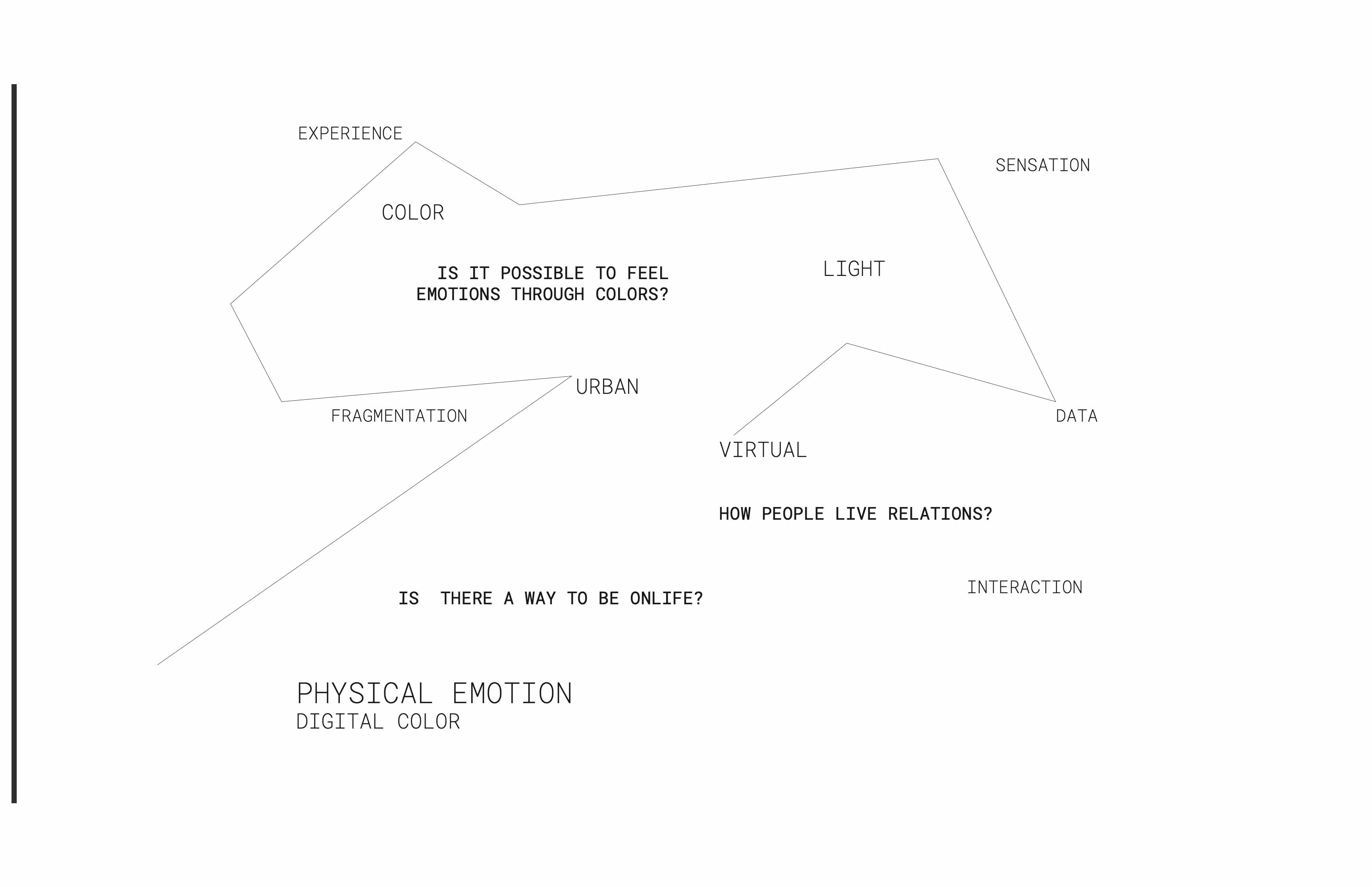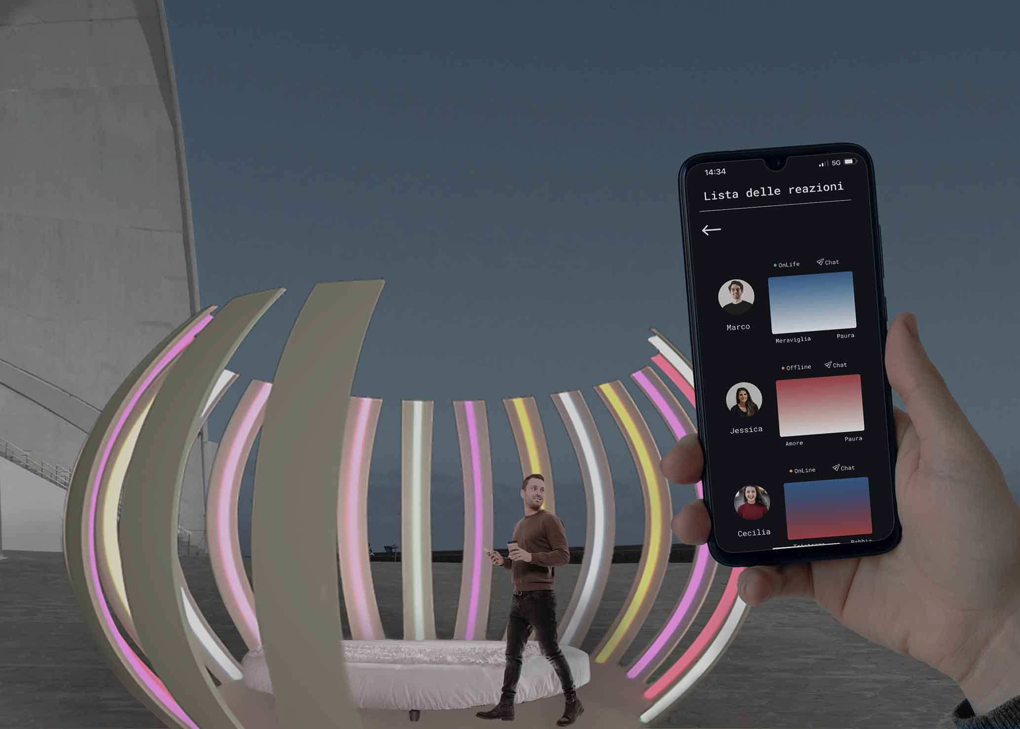 Attraverso l’uso innovativo della luce e dei colori, il progetto si propone di promuovere una riflessione sulla natura della socialità nell’era digitale. Nasce dall’analisi delle interazioni umane nel contesto della società dell’informazione, sempre più dominata dal mondo virtuale, e dalla comprensione delle emozioni legate alla luce. Questo social network, incarnato in un dispositivo luminoso situato in uno spazio esterno, offre agli utenti la possibilità di condividere pensieri e rispondere attraverso colori ed emozioni. Le reazioni dei partecipanti ai post pubblicati nell’app vengono trasformate in suggestive animazioni di luci colorate, creando così un’esperienza coinvolgente e interattiva che sfida i confini tra il mondo fisico e quello digitale.